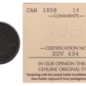 This 1858 Canadian 1 Cent coin is a remarkable piece of numismatic history, showcasing the youthful visage of Queen Victoria adorned with a laurel wreath. Struck in bronze, this circulated coin carries a tangible connection to Canada’s past, making it an appealing addition for collectors and investors alike. Graded F 12 by ICCS, it features a beautifully detailed reverse with its face value encircled by a vine and maple leaves, emphasizing its heritage. With a mintage of just 421,000, this coin is not only a collectible treasure but also holds the potential for value appreciation over time.