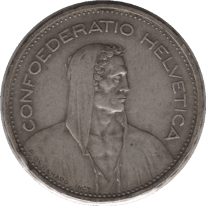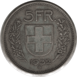 1932 Switzerland |Silver 5 Francs Coin, Edge Type 1 (KM# 40, Schn# 36, Y# 36)