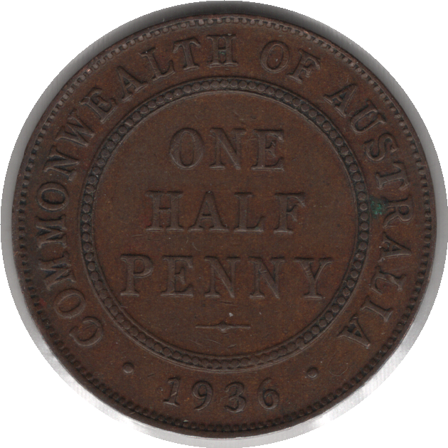 - Reverse: In the center within a circle of beads, the words ONE HALF PENNY in three lines above a plain scroll; around the circle of beads, COMMONWEALTH OF AUSTRALIA . 1911