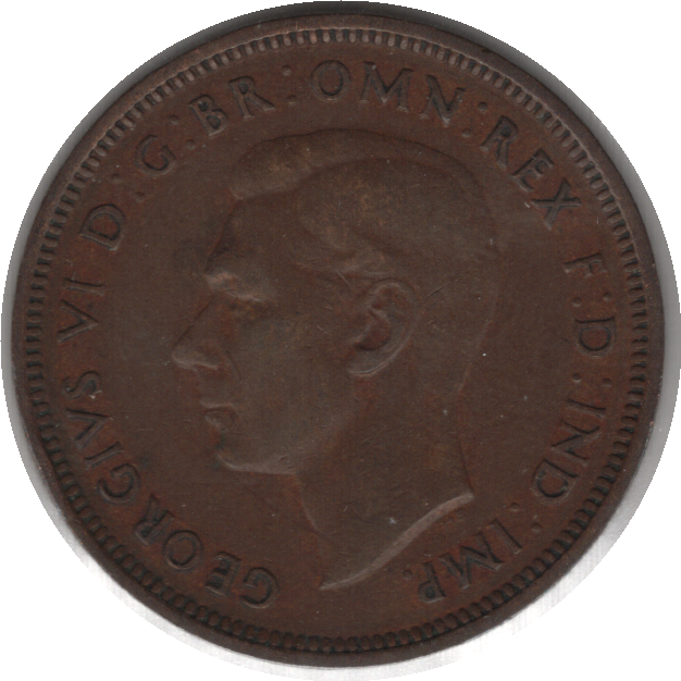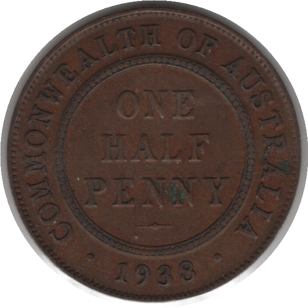 • Reverse: At centre within a circle of beads, the words ONE HALF PENNY in three lines above a plain scroll; around the circle of beads, COMMONWEALTH OF AUSTRALIA . 1938