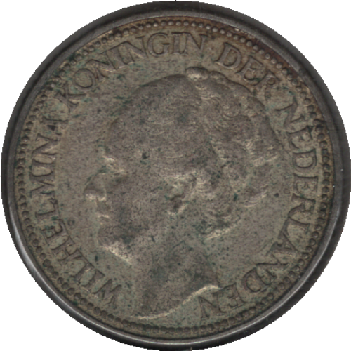• Obverse: Head of Queen Wilhelmina facing left, hair raised. Lettering around outside.