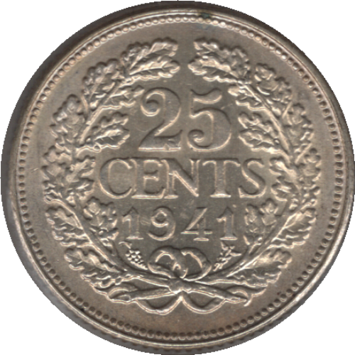 This 1941 Netherlands 25 Cents coin is a striking piece of history, featuring the elegant profile of Queen Wilhelmina on the obverse and a detailed wreath surrounding the denomination and date on the reverse. Crafted from .640 silver and measuring 19mm in diameter, this coin is a valuable addition for collectors and investors alike, with catalogue references KM# 164 and Schön# 44.
