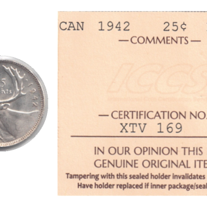 This 1942 25-cent coin from the Bank of Canada features a stunning obverse of King George VI and a beautifully detailed caribou on the reverse, crafted from .800 silver and graded MS-64 by ICCS. With its historical significance and exquisite design, this piece is a must-have for collectors and investors seeking to enhance their Canadian numismatic portfolio.
