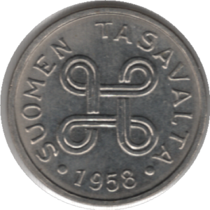 This 1958 Finland 1 Markka coin, made of nickel-plated iron and measuring 16mm in diameter, features a unique design of four joined loops on the obverse with the date below, and clasped hands flanking the denomination on the reverse. A must-have for collectors and investors alike, this piece is cataloged as KM# 36a and Schön# 39a, making it a valuable addition to any numismatic collection.