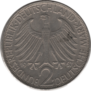 This 1967 2 Deutsche Mark coin from the Federal Republic of Germany features a striking obverse design with an eagle emblem and the denomination, while the reverse honors physicist Max Planck, the father of quantum theory, with his portrait and inscription. Crafted from a durable copper-nickel alloy, this collectible piece not only represents German heritage but also serves as a valuable addition to any numismatic collection.