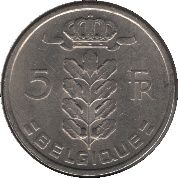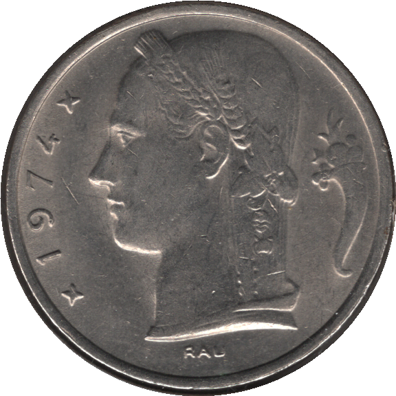 1974 Belgium 5 Francs Coin, French Text, Coinage Alignment (KM# 134, Schn# 106, LA# BFM-137)